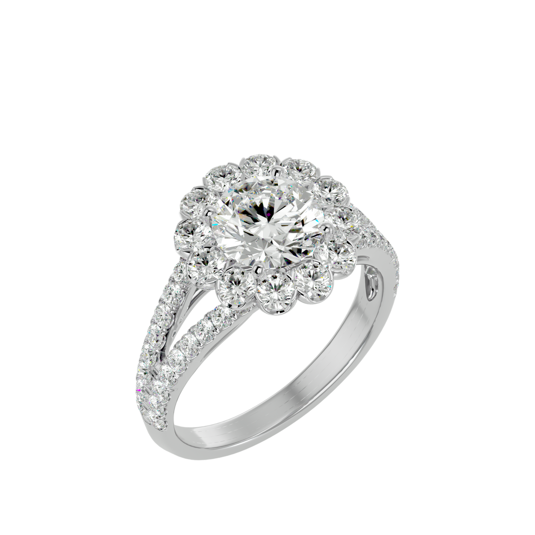 Embrace nature-inspired beauty with this ring, showcasing a floral halo and accented with a split...