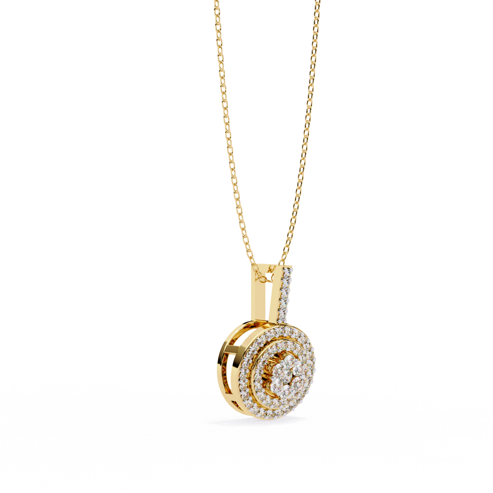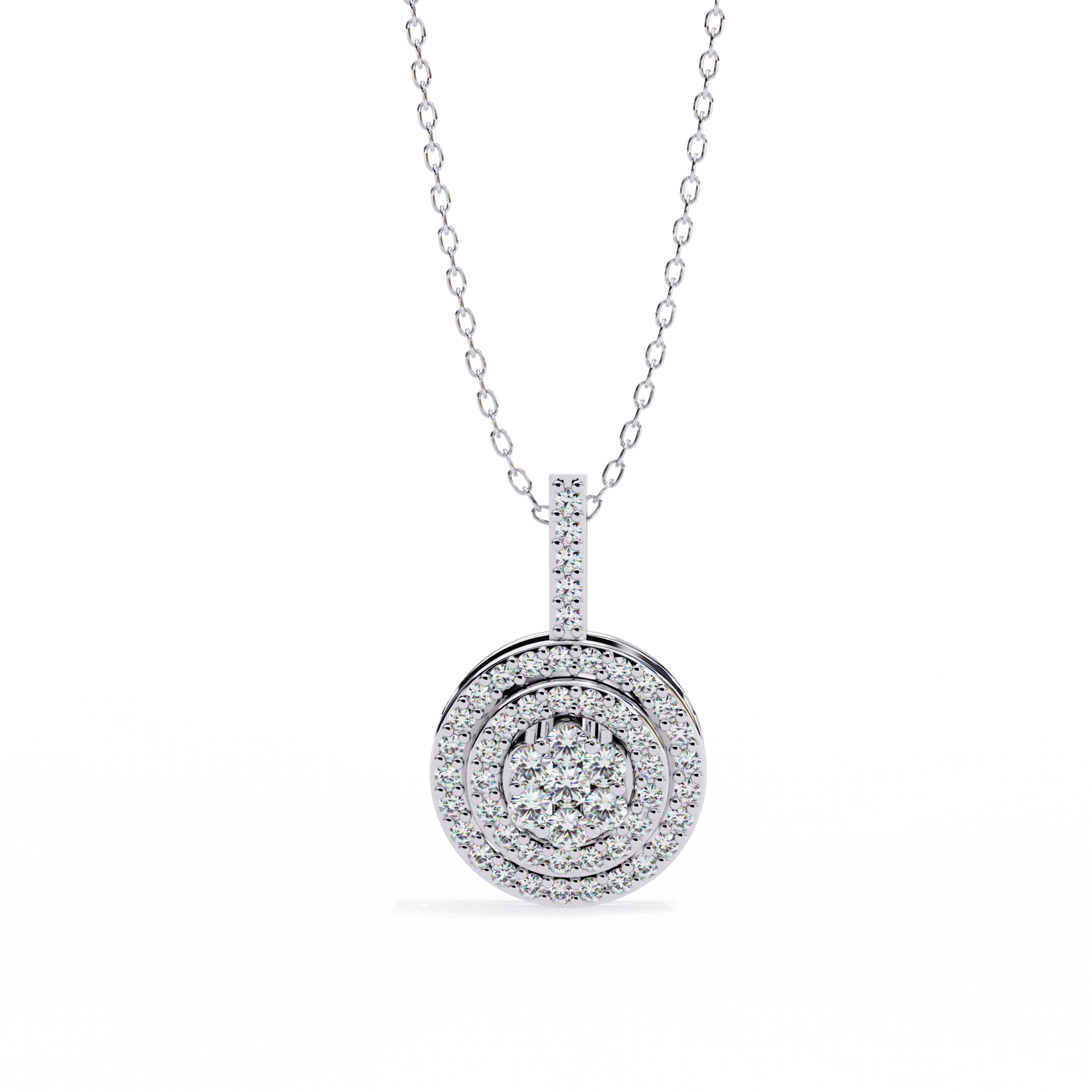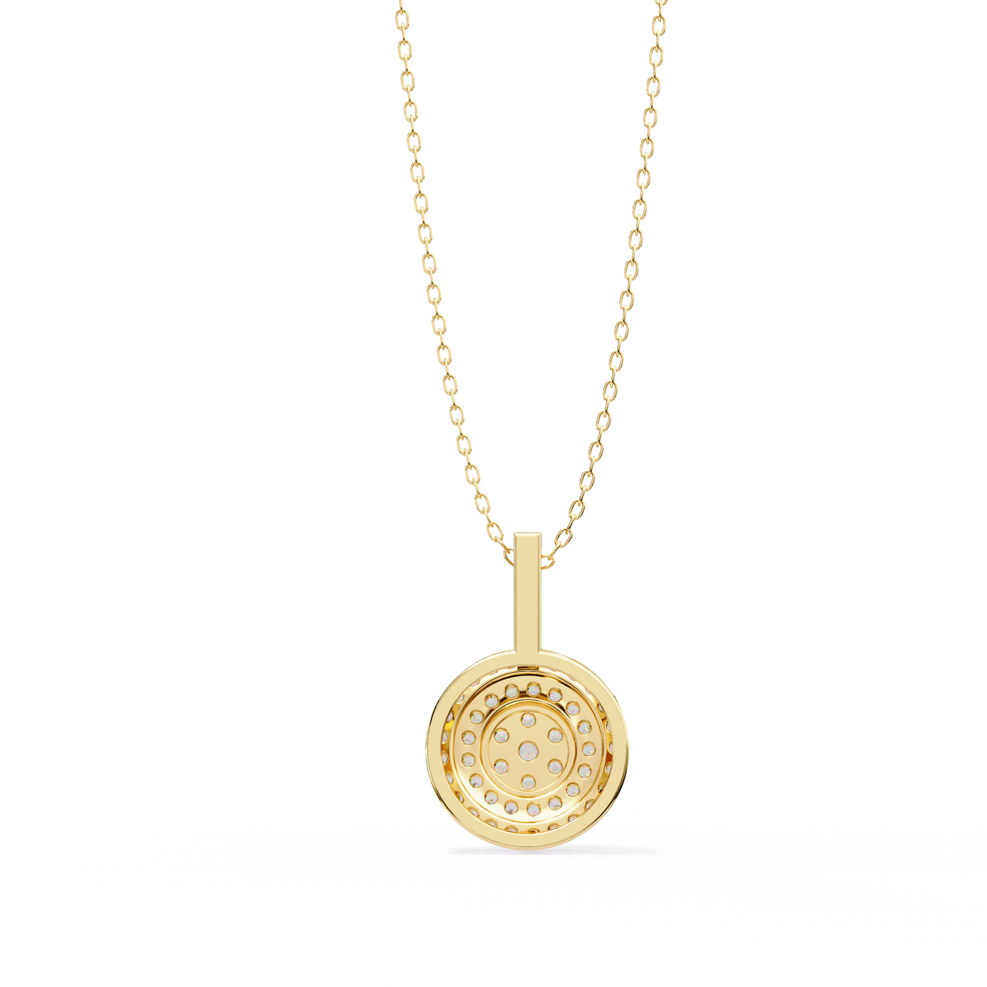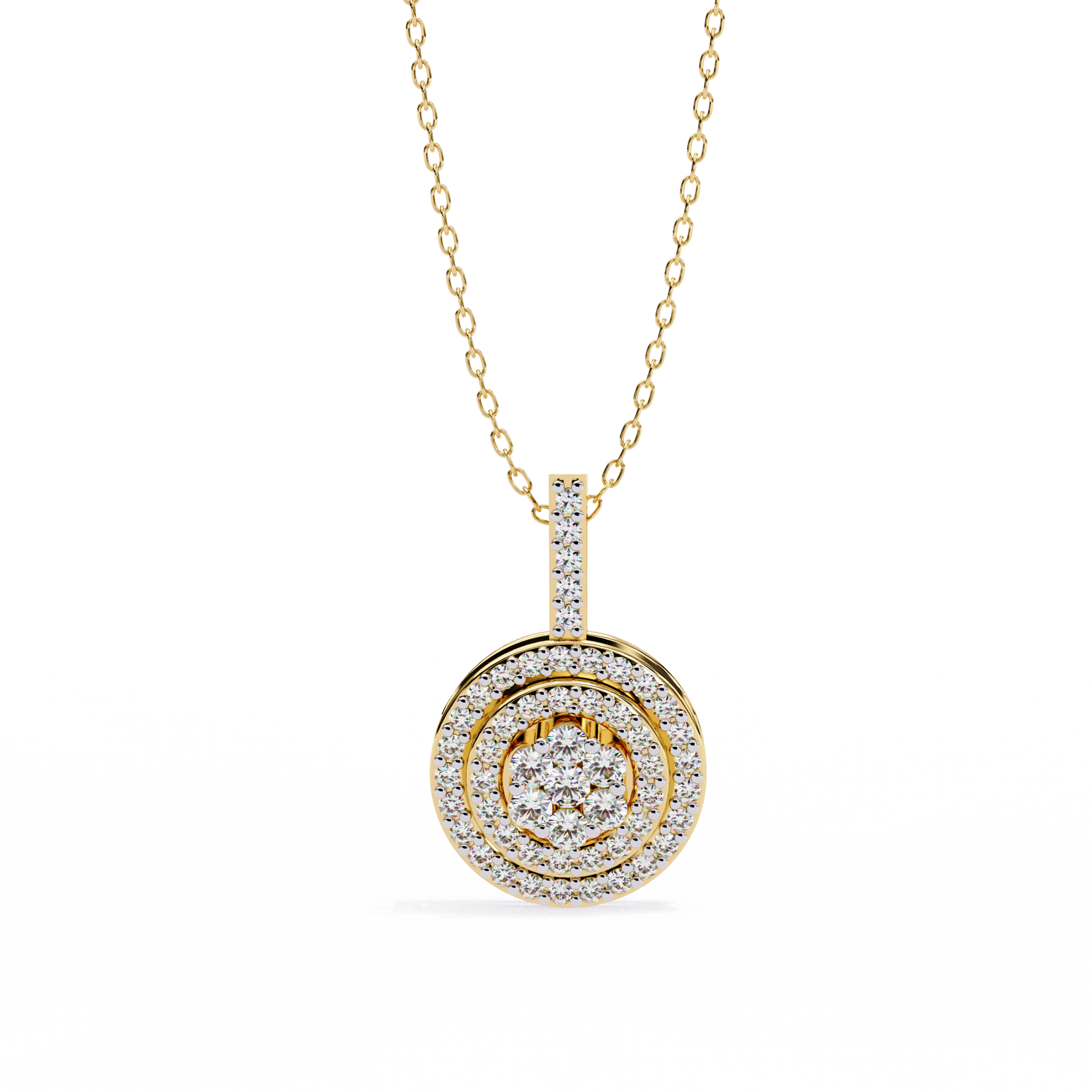 Elevate your elegance with this double-halo diamond circle pendant. Crafted in gold with VVS-EF diamond quality, this pendant offers a radiant and sophisticated sparkle.