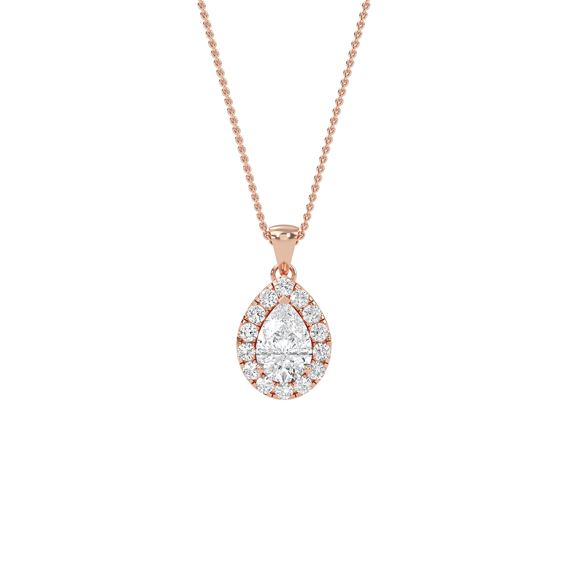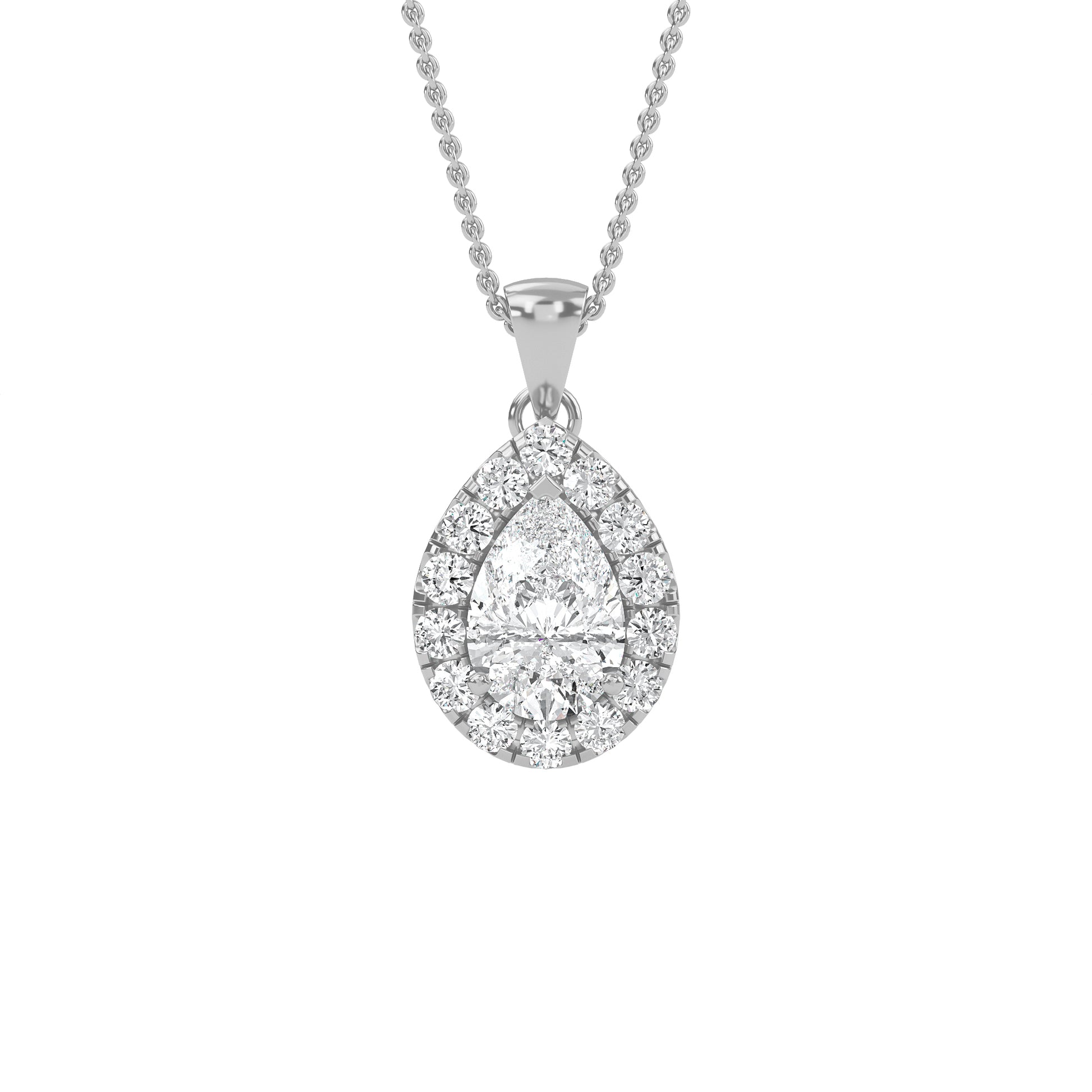 Adorn your neckline with this pear-diamond halo pendant, exuding delicate charm and grace. This piece is crafted in 14k gold with VVS-EF diamonds, creating an eye-catching sparkle.