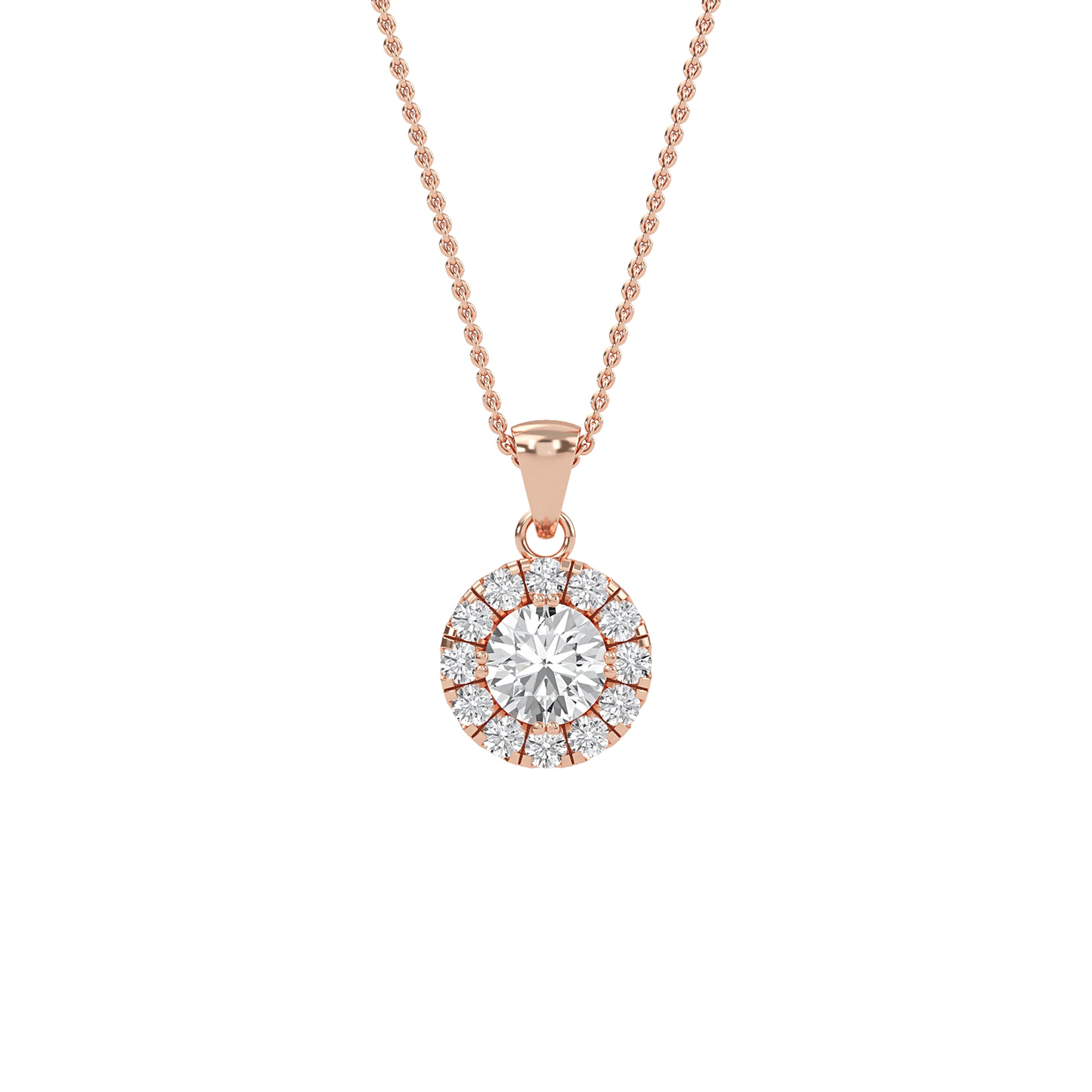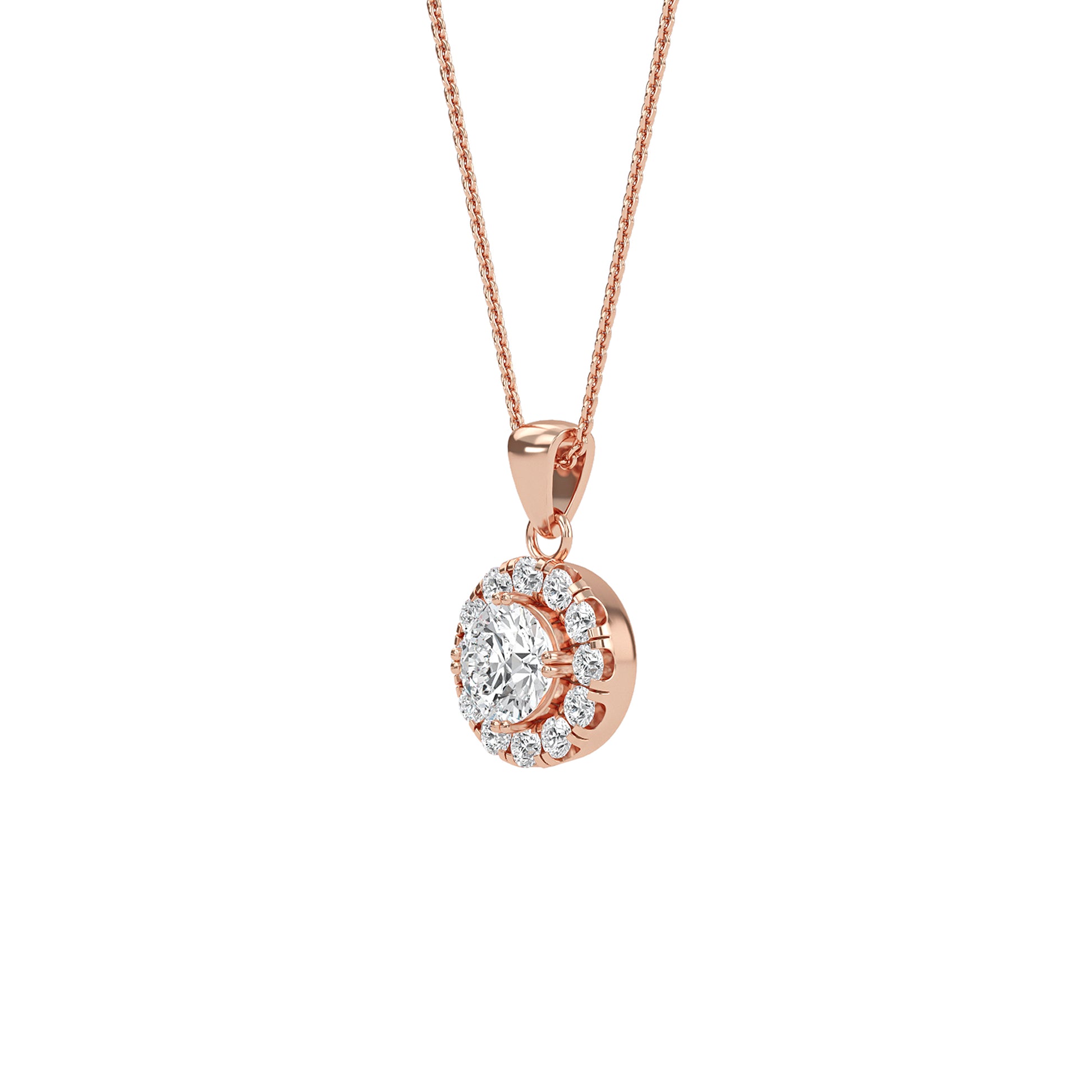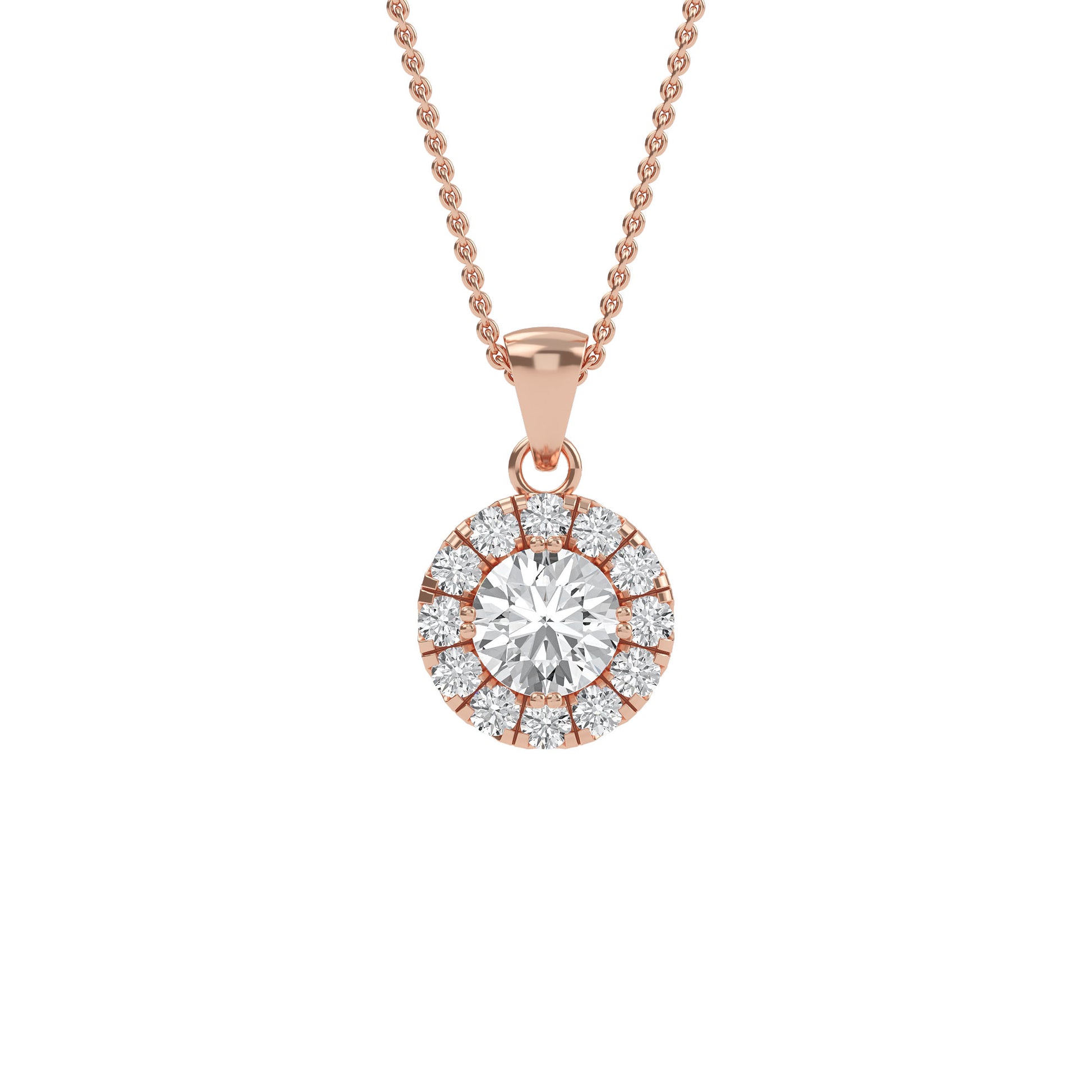 Celebrate classic beauty with this gorgeous pendant, featuring a round-cut diamond. Surrounded by a shimmering halo and set in 14k gold with VVS-EF diamonds, it's an emblem of grace and timeless style.