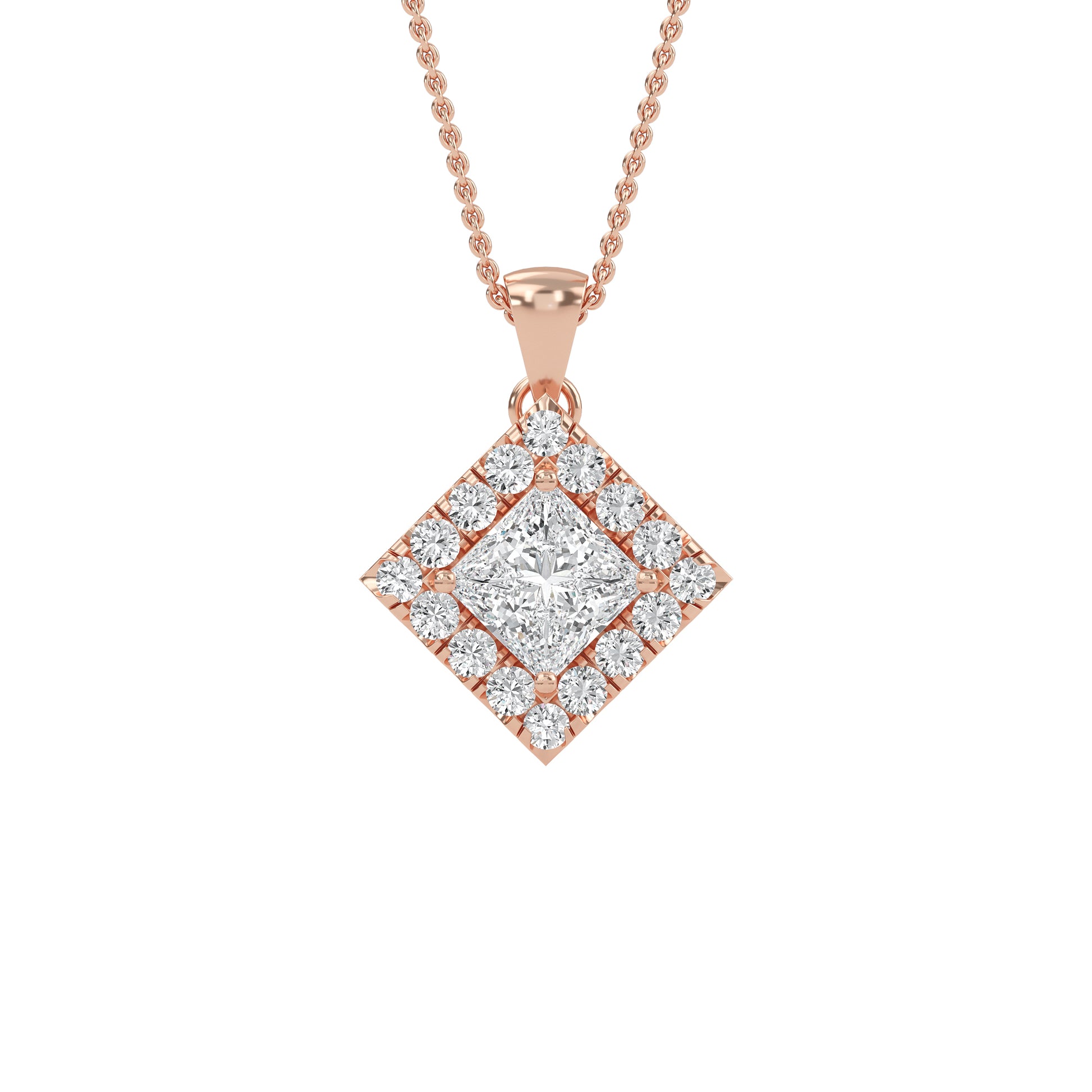 Experience refined beauty with this square-diamond halo pendant, offering a unique twist on classic elegance. Set in 14k gold with VVS-EF diamonds, this radiant piece makes an unforgettable statement.