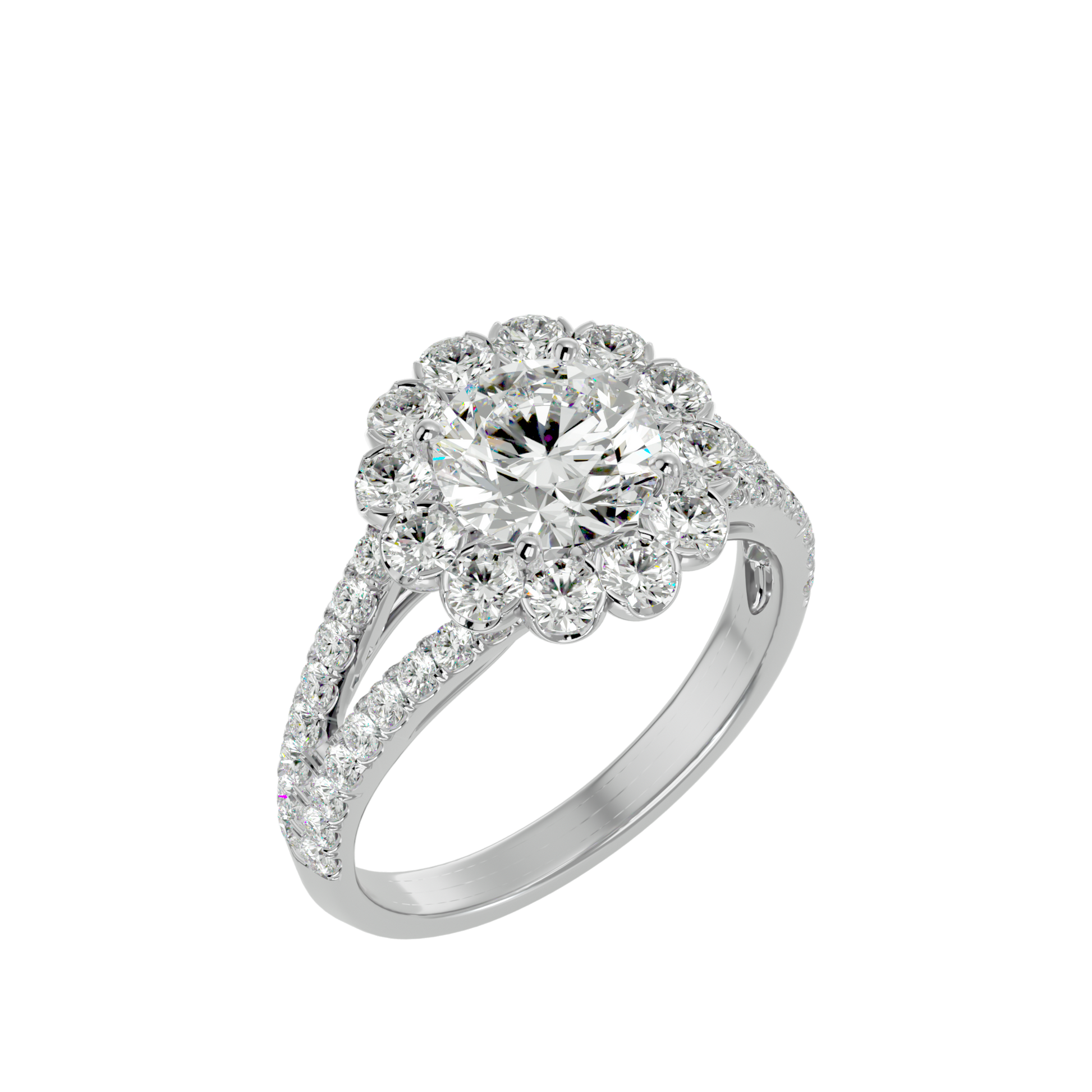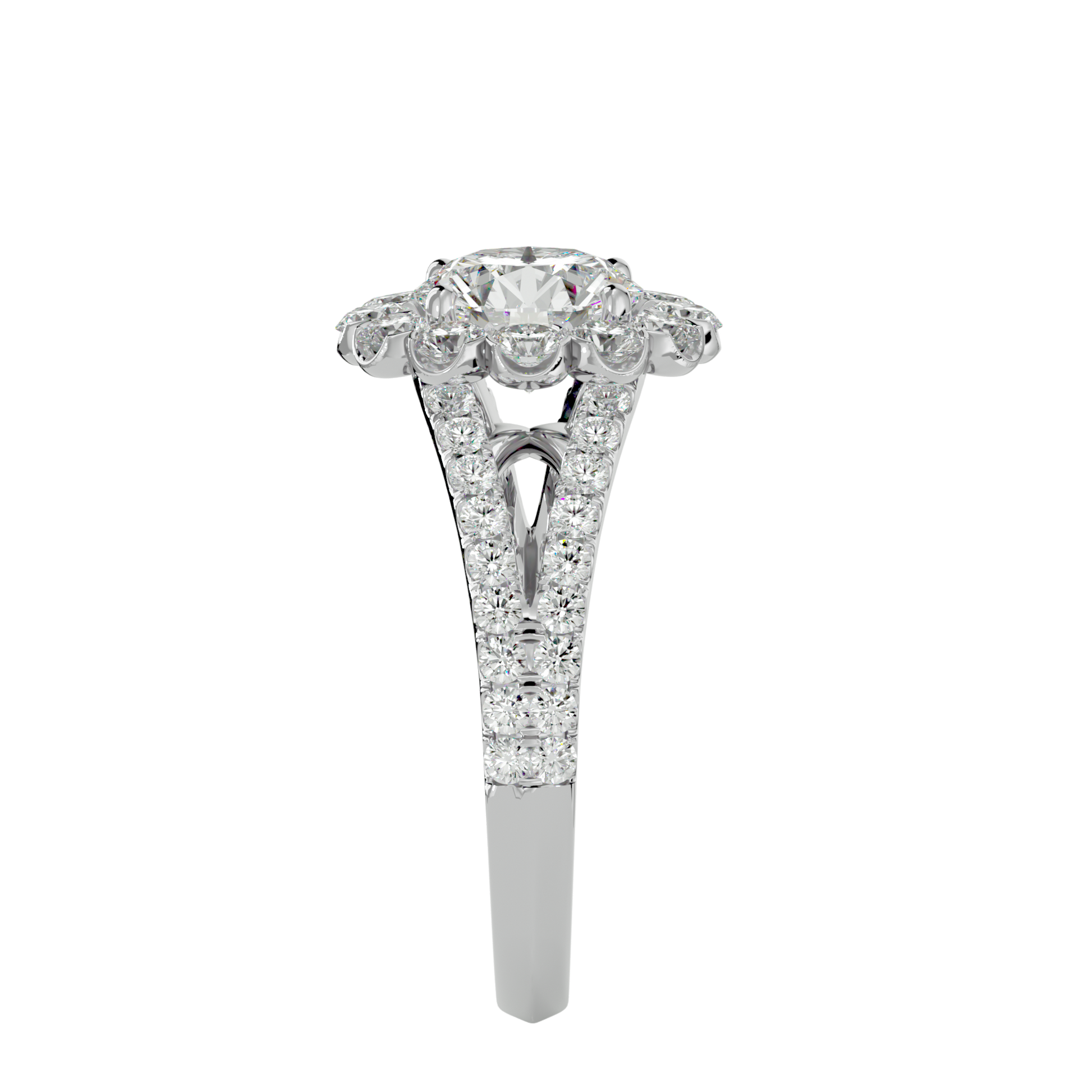 Embrace nature-inspired beauty with this ring, showcasing a floral halo and accented with a split shank. Set in 14k gold and crafted with gorgeous VVS-EF diamonds, it embodies romance.