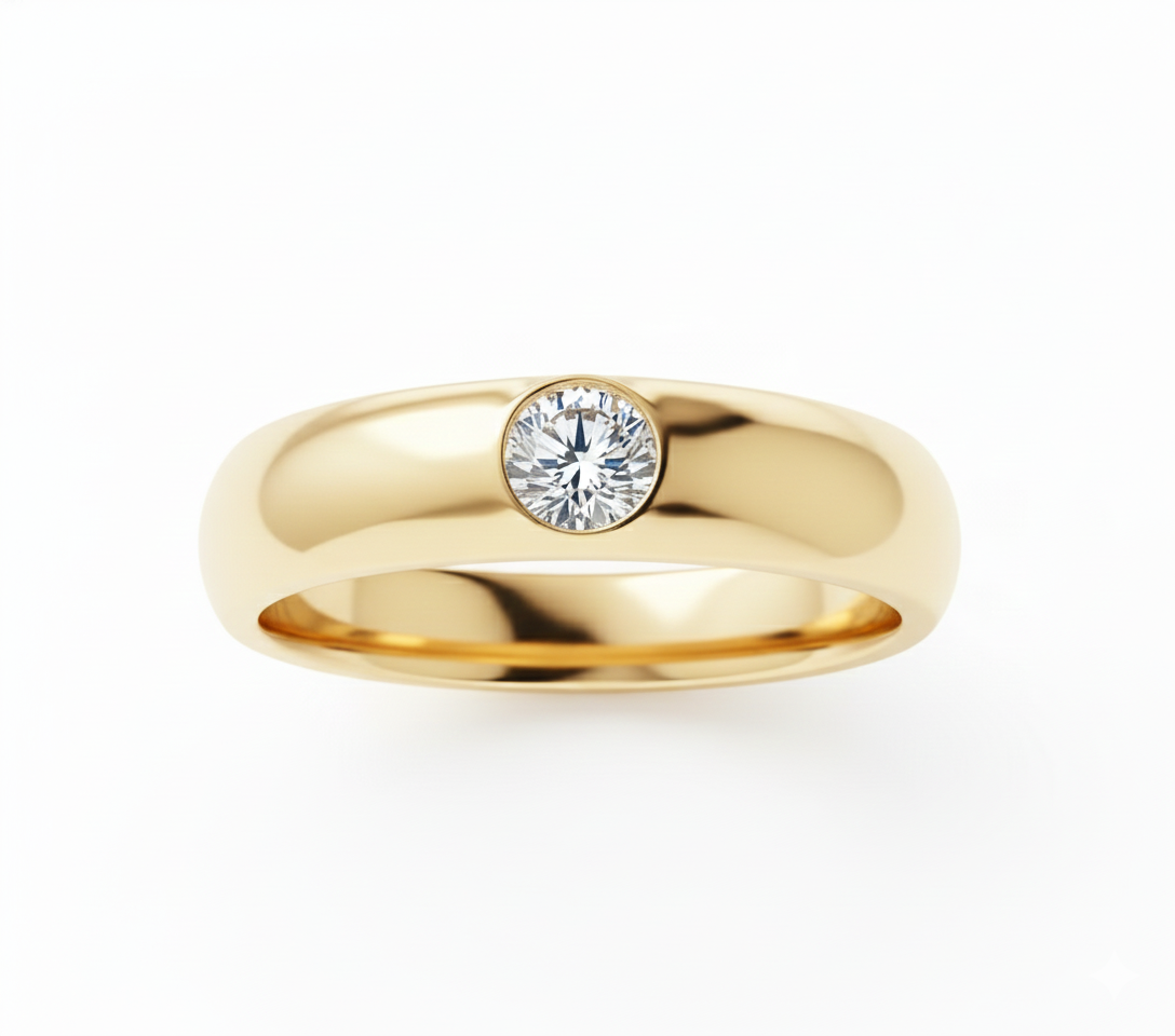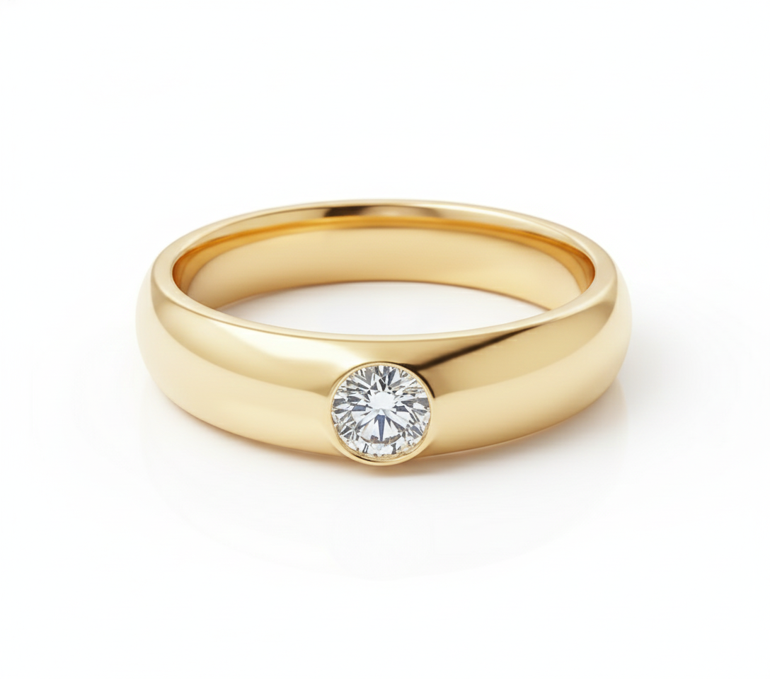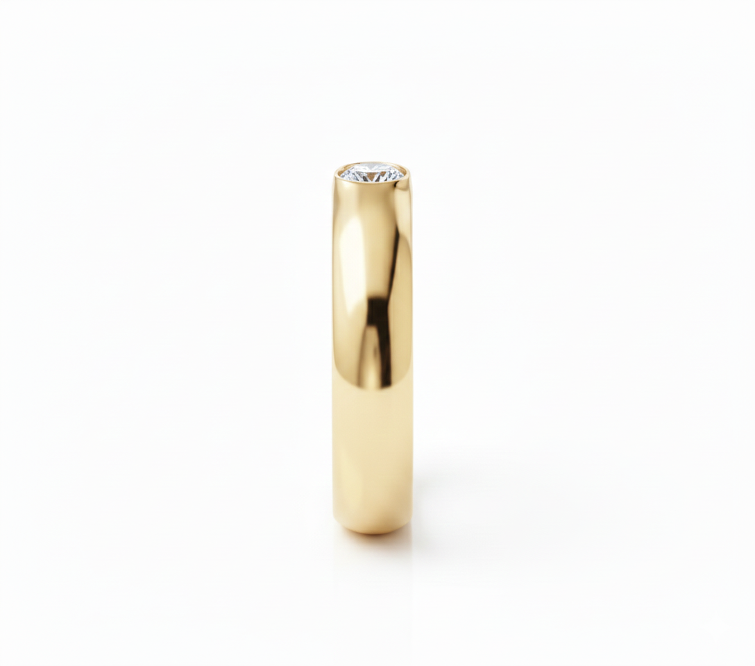 The Orbit Solitaire Band is a masterpiece of contemporary architecture, crafted in highly polished white gold into a wide, substantial band. This signature piece is defined by its deep, curved channel that creates a striking visual sweep, within which a brilliant round diamond is expertly set. Utilizing a modern tension-style illusion, the diamond appears to be perfectly suspended, orbiting the center of the band. This dynamic setting maximizes the stone's brilliance while the substantial metalwork provides a clean, executive-level aesthetic, resulting in a unique piece that is both grounded in strength and eternally elegant.