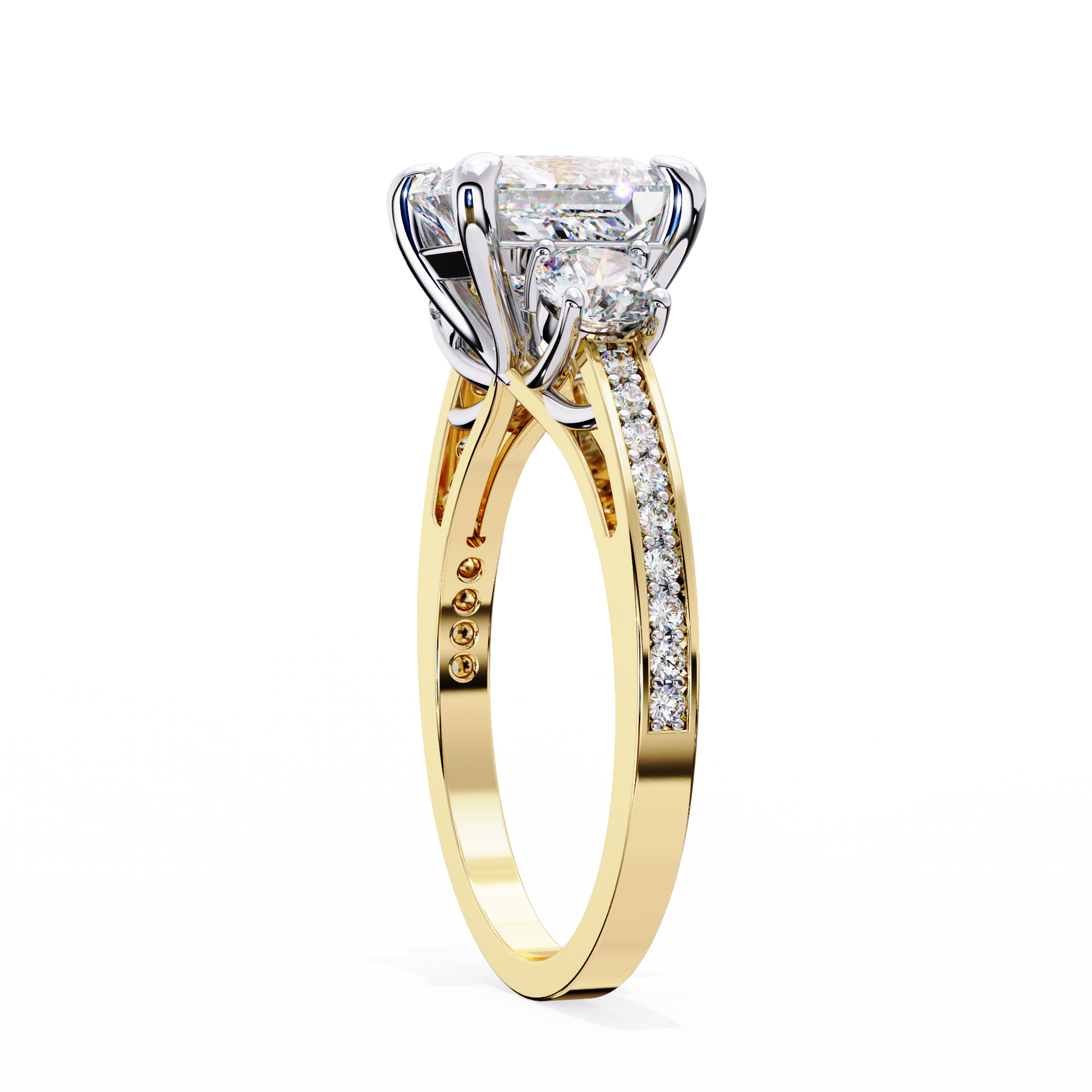 Celebrate your journey with this three-stone sparkle A. Jaffe engagement ring. Featuring a 1.5ct center stone set in gold, this ring symbolizes your past, present, and future.